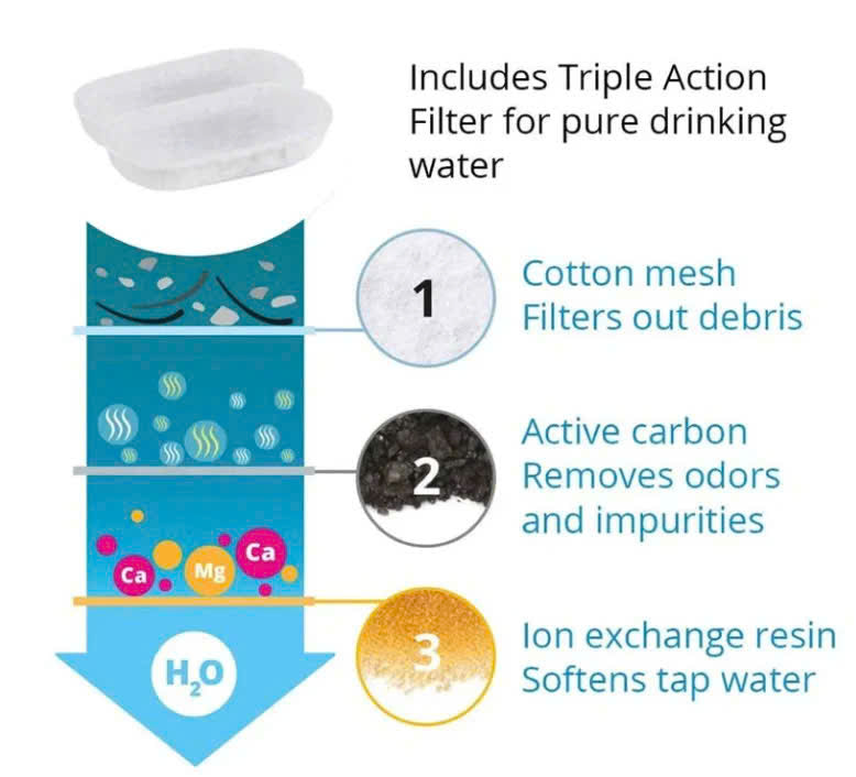 Our advanced multiple filtration system ensures every sip your cat takes is clean and healthy. The triple action filter combines a cotton mesh to capture hair and debris, activated carbon to remove odors and impurities, and ion exchange resin to soften tap water — delivering pure, fresh hydration your cat will love every day